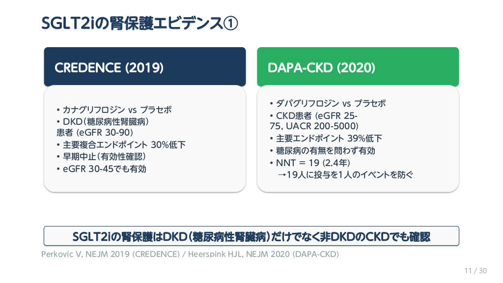 #12. SGLT2iの腎保護エビデンス① CREDENCE (2019) DAPA-CKD (2020) • カナグリフロジン vs プラセボ • DKD(糖尿病性腎臓病) 患者 (eGFR 30-90) • 主要複合エンドポイント 30%低下 • 早期中止(有効性確認) • eGFR 30-45でも有効 • ダパグリフロジン vs プラセボ • CKD患者 (eGFR 2575, UACR 200-5000) • 主要エンドポイント 39%低下 • 糖尿病の有無を問わず有効 • NNT = 19 (2.4年) →19人に投与を1人のイベントを防ぐ SGLT2iの腎保護はDKD(糖尿病性腎臓病)だけでなく非DKDのCKDでも確認 Perkovic V, NEJM 2019 (CREDENCE) / Heerspink HJL, NEJM 2020 (DAPA-CKD) 11 / 30