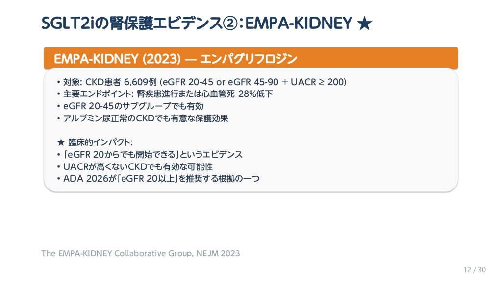 #13. SGLT2iの腎保護エビデンス②:EMPA-KIDNEY ★ EMPA-KIDNEY (2023) — エンパグリフロジン • • • • 対象: CKD患者 6,609例 (eGFR 20-45 or eGFR 45-90 + UACR ≥ 200) 主要エンドポイント: 腎疾患進行または心血管死 28%低下 eGFR 20-45のサブグループでも有効 アルブミン尿正常のCKDでも有意な保護効果 ★ 臨床的インパクト: • 「eGFR 20からでも開始できる」というエビデンス • UACRが高くないCKDでも有効な可能性 • ADA 2026が「eGFR 20以上」を推奨する根拠の一つ The EMPA-KIDNEY Collaborative Group, NEJM 2023 12 / 30