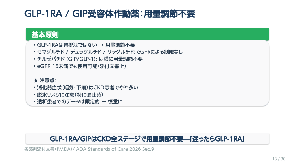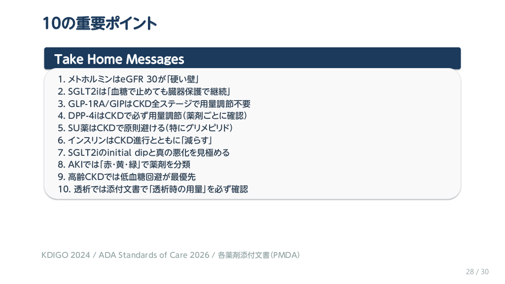 #29. 10の重要ポイント Take Home Messages 1. メトホルミンはeGFR 30が「硬い壁」 2. SGLT2iは「血糖で止めても臓器保護で継続」 3. GLP-1RA/GIPはCKD全ステージで用量調節不要 4. DPP-4iはCKDで必ず用量調節(薬剤ごとに確認) 5. SU薬はCKDで原則避ける(特にグリメピリド) 6. インスリンはCKD進行とともに「減らす」 7. SGLT2iのinitial dipと真の悪化を見極める 8. AKIでは「赤・黄・緑」で薬剤を分類 9. 高齢CKDでは低血糖回避が最優先 10. 透析では添付文書で「透析時の用量」を必ず確認 KDIGO 2024 / ADA Standards of Care 2026 / 各薬剤添付文書(PMDA) 28 / 30