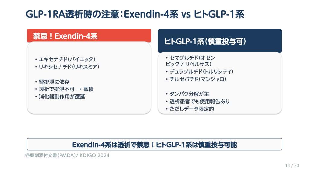#15. GLP-1RA透析時の注意:Exendin-4系 vs ヒトGLP-1系 禁忌!Exendin-4系 • エキセナチド(バイエッタ) • リキシセナチド(リキスミア) • 腎排泄に依存 • 透析で排泄不可 → 蓄積 • 消化器副作用が遷延 ヒトGLP-1系(慎重投与可) • セマグルチド(オゼン ピック / リベルサス) • デュラグルチド(トルリシティ) • チルゼパチド(マンジャロ) • タンパク分解が主 • 透析患者でも使用報告あり • ただしデータ限定的 Exendin-4系は透析で禁忌!ヒトGLP-1系は慎重投与可能 各薬剤添付文書(PMDA)/ KDIGO 2024 14 / 30