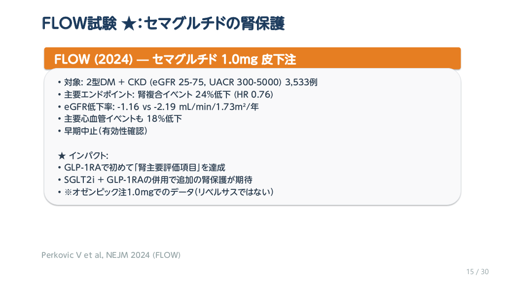 #16. FLOW試験 ★:セマグルチドの腎保護 FLOW (2024) — セマグルチド 1.0mg 皮下注 • • • • • 対象: 2型DM + CKD (eGFR 25-75, UACR 300-5000) 3,533例 主要エンドポイント: 腎複合イベント 24%低下 (HR 0.76) eGFR低下率: -1.16 vs -2.19 mL/min/1.73m²/年 主要心血管イベントも 18%低下 早期中止(有効性確認) ★ インパクト: • GLP-1RAで初めて「腎主要評価項目」を達成 • SGLT2i + GLP-1RAの併用で追加の腎保護が期待 • ※オゼンピック注1.0mgでのデータ(リベルサスではない) Perkovic V et al, NEJM 2024 (FLOW) 15 / 30