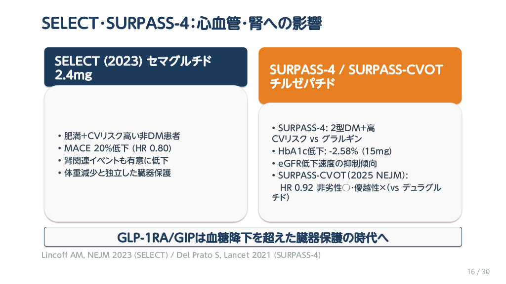 #17. SELECT・SURPASS-4:心血管・腎への影響 SELECT (2023) セマグルチド 2.4mg • • • • 肥満+CVリスク高い非DM患者 MACE 20%低下 (HR 0.80) 腎関連イベントも有意に低下 体重減少と独立した臓器保護 SURPASS-4 / SURPASS-CVOT チルゼパチド • SURPASS-4: 2型DM+高 CVリスク vs グラルギン • HbA1c低下: -2.58% (15mg) • eGFR低下速度の抑制傾向 • SURPASS-CVOT(2025 NEJM): HR 0.92 非劣性○・優越性×(vs デュラグル チド) GLP-1RA/GIPは血糖降下を超えた臓器保護の時代へ Lincoff AM, NEJM 2023 (SELECT) / Del Prato S, Lancet 2021 (SURPASS-4) 16 / 30