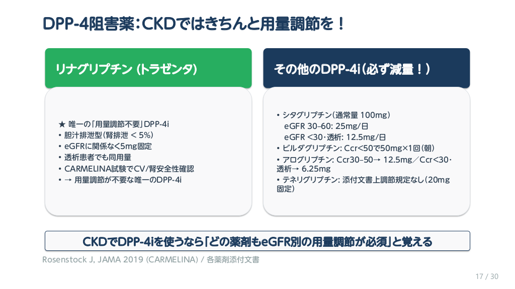 #18. DPP-4阻害薬:CKDではきちんと用量調節を! リナグリプチン (トラゼンタ) ★ 唯一の「用量調節不要」DPP-4i • 胆汁排泄型(腎排泄 < 5%) • eGFRに関係なく5mg固定 • 透析患者でも同用量 • CARMELINA試験でCV/腎安全性確認 • → 用量調節が不要な唯一のDPP-4i その他のDPP-4i(必ず減量!) • シタグリプチン(通常量 100mg) eGFR 30–60: 25mg/日 eGFR <30・透析: 12.5mg/日 • ビルダグリプチン: Ccr<50で50mg×1回(朝) • アログリプチン: Ccr30–50→ 12.5mg/Ccr<30・ 透析→ 6.25mg • テネリグリプチン: 添付文書上調節規定なし(20mg 固定) CKDでDPP-4iを使うなら「どの薬剤もeGFR別の用量調節が必須」と覚える Rosenstock J, JAMA 2019 (CARMELINA) / 各薬剤添付文書 17 / 30