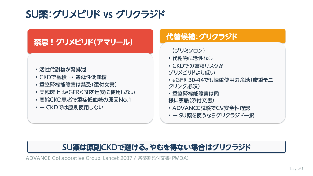 #19. SU薬:グリメピリド vs グリクラジド 禁忌!グリメピリド(アマリール) • • • • • • 活性代謝物が腎排泄 CKDで蓄積 → 遷延性低血糖 重筌腎機能障害は禁忌(添付文書) 実臨床上はeGFR<30を目安に使用しない 高齢CKD患者で重症低血糖の原因No.1 → CKDでは原則使用しない 代替候補:グリクラジド (グリミクロン) • 代謝物に活性なし • CKDでの蓄積リスクが グリメピリドより低い • eGFR 30-44でも慎重使用の余地(厳重モニ タリング必須) • 重筌腎機能障害は同 様に禁忌(添付文書) • ADVANCE試験でCV安全性確認 • → SU薬を使うならグリクラジド一択 SU薬は原則CKDで避ける。やむを得ない場合はグリクラジド ADVANCE Collaborative Group, Lancet 2007 / 各薬剤添付文書(PMDA) 18 / 30