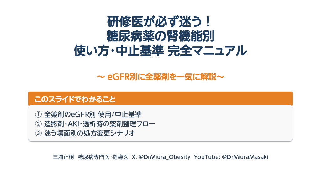 #2. 研修医が必ず迷う! 糖尿病薬の腎機能別 使い方・中止基準 完全マニュアル 〜 eGFR別に全薬剤を一気に解説〜 このスライドでわかること ① 全薬剤のeGFR別 使用/中止基準 ② 造影剤・AKI・透析時の薬剤整理フロー ③ 迷う場面別の処方変更シナリオ 三浦正樹 糖尿病専門医・指導医 X: @DrMiura_Obesity YouTube: @DrMiuraMasaki