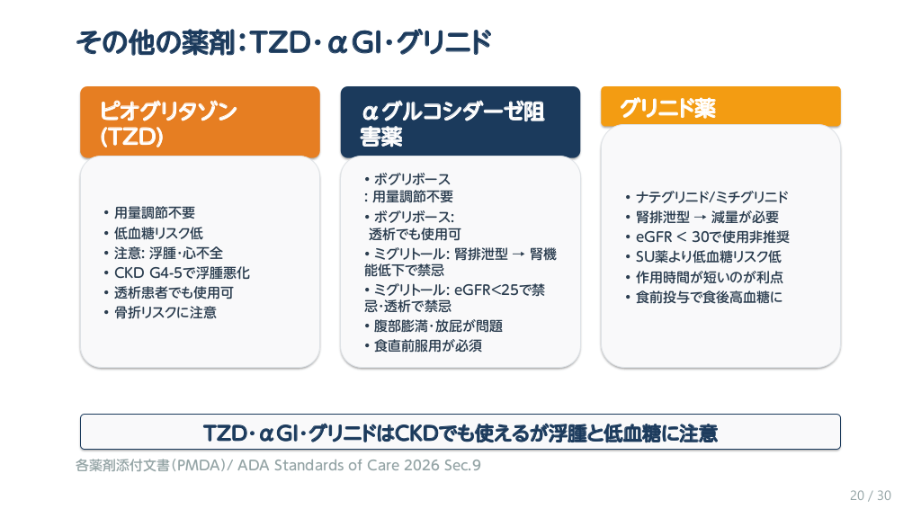 #21. その他の薬剤:TZD・αGI・グリニド ピオグリタゾン (TZD) • • • • • • 用量調節不要 低血糖リスク低 注意: 浮腫・心不全 CKD G4-5で浮腫悪化 透析患者でも使用可 骨折リスクに注意 αグルコシダーゼ阻 害薬 • ボグリボース : 用量調節不要 • ボグリボース: 透析でも使用可 • ミグリトール: 腎排泄型 → 腎機 能低下で禁忌 • ミグリトール: eGFR<25で禁 忌・透析で禁忌 • 腹部膨満・放屁が問題 • 食直前服用が必須 グリニド薬 • • • • • • ナテグリニド/ミチグリニド 腎排泄型 → 減量が必要 eGFR < 30で使用非推奨 SU薬より低血糖リスク低 作用時間が短いのが利点 食前投与で食後高血糖に TZD・αGI・グリニドはCKDでも使えるが浮腫と低血糖に注意 各薬剤添付文書(PMDA)/ ADA Standards of Care 2026 Sec.9 20 / 30