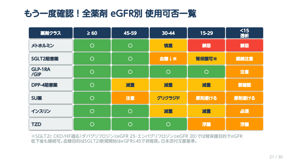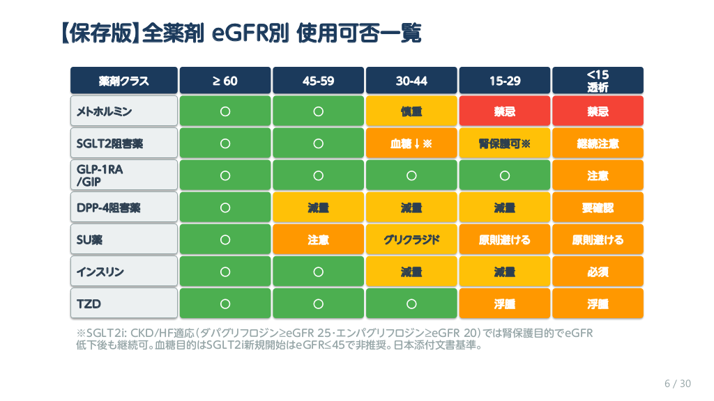 #7. 【保存版】全薬剤 eGFR別 使用可否一覧 ≥ 60 45-59 30-44 15-29 <15 透析 メトホルミン ○ ○ 慎重 禁忌 禁忌 SGLT2阻害薬 ○ ○ 血糖↓※ 腎保護可※ 継続注意 GLP-1RA /GIP ○ ○ ○ ○ 注意 DPP-4阻害薬 ○ 減量 減量 減量 要確認 SU薬 ○ 注意 グリクラジド 原則避ける 原則避ける インスリン ○ ○ 減量 減量 必須 TZD ○ ○ ○ 浮腫 浮腫 薬剤クラス ※SGLT2i: CKD/HF適応(ダパグリフロジン≥eGFR 25・エンパグリフロジン≥eGFR 20)では腎保護目的でeGFR 低下後も継続可。血糖目的はSGLT2i新規開始はeGFR≤45で非推奨。日本添付文書基準。 6 / 30