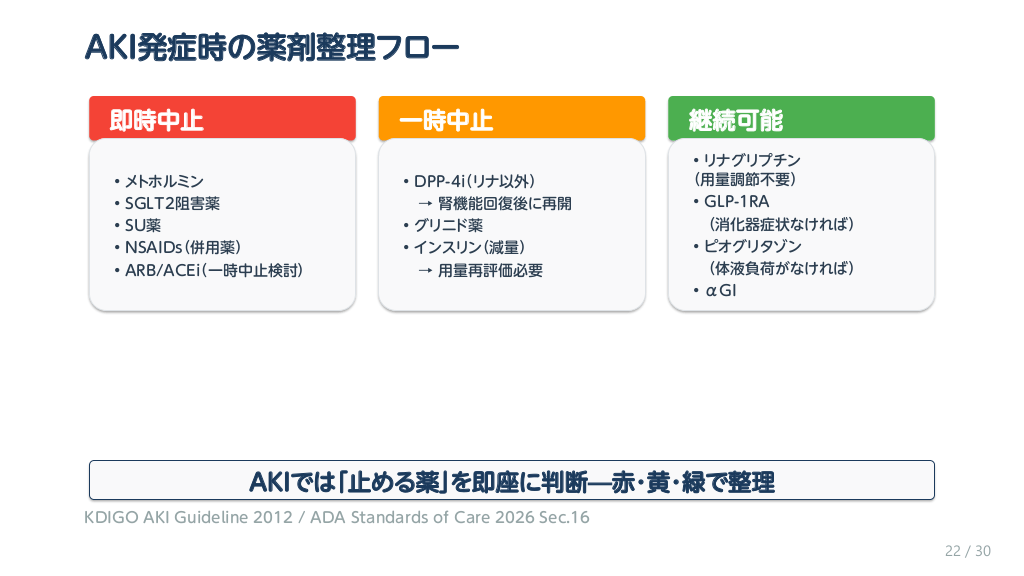 #23. AKI発症時の薬剤整理フロー 即時中止 • • • • • メトホルミン SGLT2阻害薬 SU薬 NSAIDs(併用薬) ARB/ACEi(一時中止検討) 一時中止 継続可能 • DPP-4i(リナ以外) → 腎機能回復後に再開 • グリニド薬 • インスリン(減量) → 用量再評価必要 • リナグリプチン (用量調節不要) • GLP-1RA (消化器症状なければ) • ピオグリタゾン (体液負荷がなければ) • αGI AKIでは「止める薬」を即座に判断—赤・黄・緑で整理 KDIGO AKI Guideline 2012 / ADA Standards of Care 2026 Sec.16 22 / 30