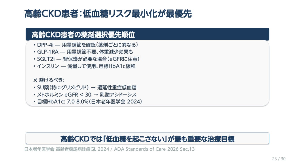 #24. 高齢CKD患者:低血糖リスク最小化が最優先 高齢CKD患者の薬剤選択優先順位 • • • • DPP-4i — 用量調節を確認(薬剤ごとに異なる) GLP-1RA — 用量調節不要、体重減少効果も SGLT2i — 腎保護が必要な場合(eGFRに注意) インスリン — 減量して使用、目標HbA1c緩和 避けるべき: • SU薬(特にグリメピリド) → 遷延性重症低血糖 • メトホルミン eGFR < 30 → 乳酸アシドーシス • 目標HbA1c: 7.0-8.0%(日本老年医学会 2024) 高齢CKDでは「低血糖を起こさない」が最も重要な治療目標 日本老年医学会 高齢者糖尿病診療GL 2024 / ADA Standards of Care 2026 Sec.13 23 / 30