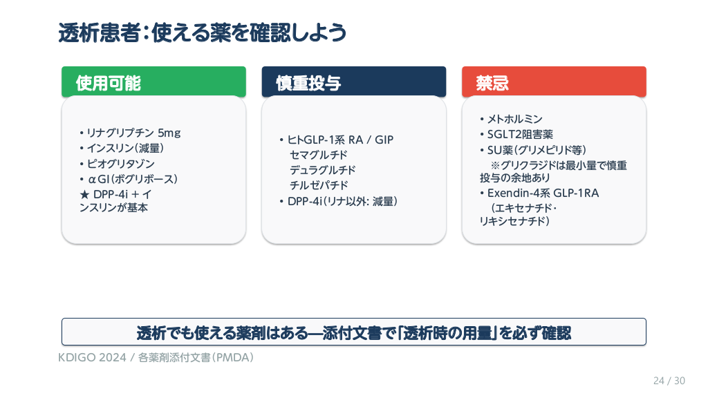 #25. 透析患者:使える薬を確認しよう 使用可能 • リナグリプチン 5mg • インスリン(減量) • ピオグリタゾン • αGI(ボグリボース) ★ DPP-4i + イ ンスリンが基本 慎重投与 • ヒトGLP-1系 RA / GIP セマグルチド デュラグルチド チルゼパチド • DPP-4i(リナ以外: 減量) 禁忌 • メトホルミン • SGLT2阻害薬 • SU薬(グリメピリド等) ※グリクラジドは最小量で慎重 投与の余地あり • Exendin-4系 GLP-1RA (エキセナチド・ リキシセナチド) 透析でも使える薬剤はある—添付文書で「透析時の用量」を必ず確認 KDIGO 2024 / 各薬剤添付文書(PMDA) 24 / 30