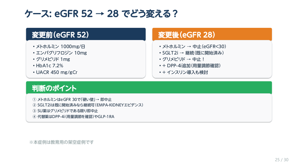 #26. ケース: eGFR 52 → 28 でどう変える? 変更前(eGFR 52) 変更後(eGFR 28) • • • • • • • • • • メトホルミン 1000mg/日 エンパグリフロジン 10mg グリメピリド 1mg HbA1c 7.2% UACR 450 mg/gCr メトホルミン → 中止(eGFR<30) SGLT2i → 継続(既に開始済み) グリメピリド → 中止! + DPP-4i追加(用量調節確認) + インスリン導入も検討 判断のポイント ① メトホルミンはeGFR 30で「硬い壁」→ 即中止 ② SGLT2iは既に開始済みなら継続可(EMPA-KIDNEYエビデンス) ③ SU薬はグリメピリドである限り即中止 ④ 代替薬はDPP-4i(用量調節を確認)やGLP-1RA ※本症例は教育用の架空症例です 25 / 30