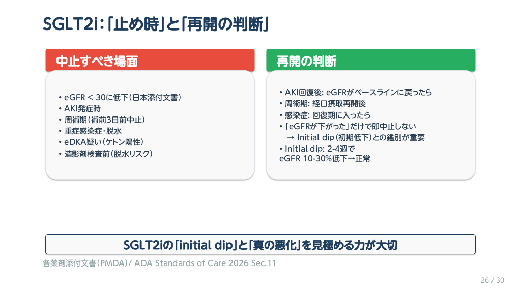 #27. SGLT2i:「止め時」と「再開の判断」 中止すべき場面 • • • • • • 再開の判断 eGFR < 30に低下(日本添付文書) AKI発症時 周術期(術前3日前中止) 重症感染症・脱水 eDKA疑い(ケトン陽性) 造影剤検査前(脱水リスク) • • • • AKI回復後: eGFRがベースラインに戻ったら 周術期: 経口摂取再開後 感染症: 回復期に入ったら 「eGFRが下がった」だけで即中止しない → Initial dip(初期低下)との鑑別が重要 • Initial dip: 2-4週で eGFR 10-30%低下→正常 SGLT2iの「initial dip」と「真の悪化」を見極める力が大切 各薬剤添付文書(PMDA)/ ADA Standards of Care 2026 Sec.11 26 / 30