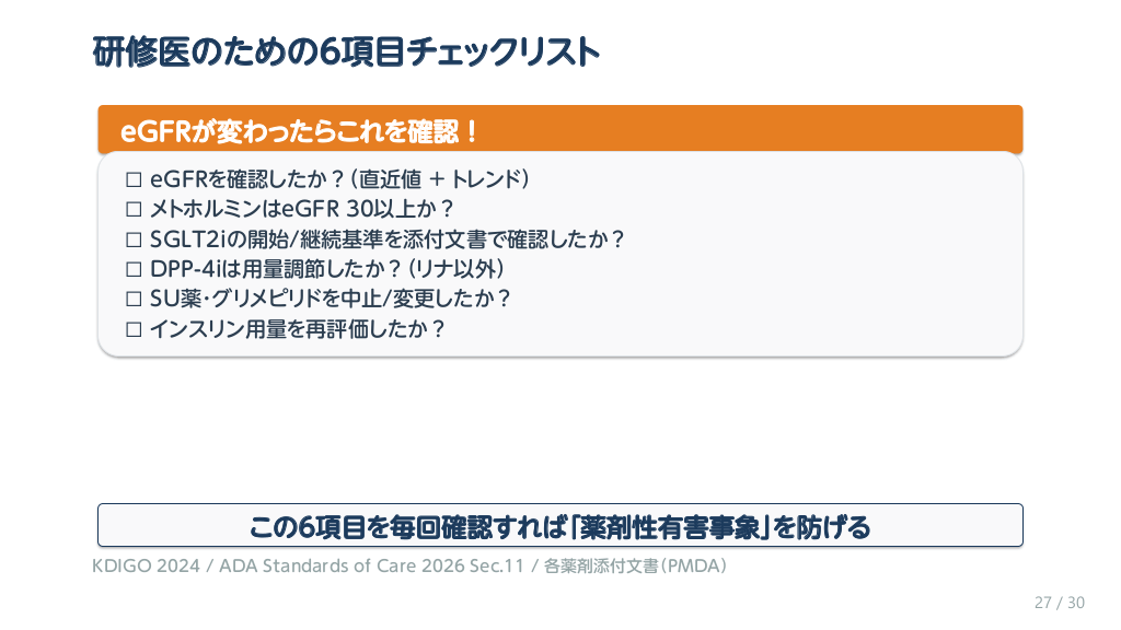 #28. 研修医のための6項目チェックリスト eGFRが変わったらこれを確認! ☐ ☐ ☐ ☐ ☐ ☐ eGFRを確認したか?(直近値 + トレンド) メトホルミンはeGFR 30以上か? SGLT2iの開始/継続基準を添付文書で確認したか? DPP-4iは用量調節したか?(リナ以外) SU薬・グリメピリドを中止/変更したか? インスリン用量を再評価したか? この6項目を毎回確認すれば「薬剤性有害事象」を防げる KDIGO 2024 / ADA Standards of Care 2026 Sec.11 / 各薬剤添付文書(PMDA) 27 / 30