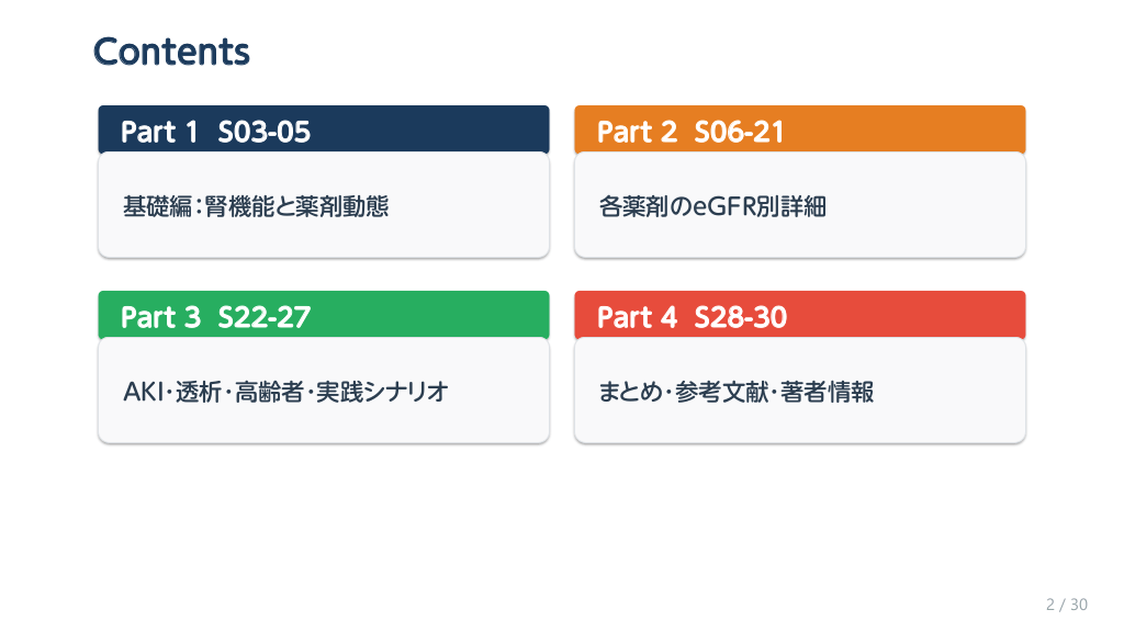 #3. Contents Part 1 S03-05 Part 2 S06-21 基礎編:腎機能と薬剤動態 各薬剤のeGFR別詳細 Part 3 S22-27 Part 4 S28-30 AKI・透析・高齢者・実践シナリオ まとめ・参考文献・著者情報 2 / 30