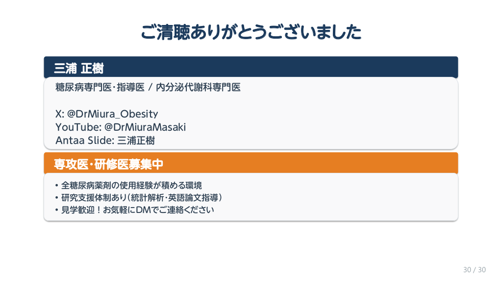 #31. ご清聴ありがとうございました 三浦 正樹 糖尿病専門医・指導医 / 内分泌代謝科専門医 X: @DrMiura_Obesity YouTube: @DrMiuraMasaki Antaa Slide: 三浦正樹 専攻医・研修医募集中 • 全糖尿病薬剤の使用経験が積める環境 • 研究支援体制あり(統計解析・英語論文指導) • 見学歓迎!お気軽にDMでご連絡ください 30 / 30