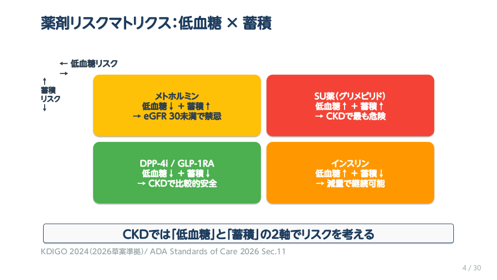 #4. 腎機能低下で何が起きるか ① 薬剤排泄の遅延 ② 低血糖リスク上昇 ③ 有害代謝物の蓄積 腎排泄型薬剤の半減期延長 DPP-4i, SU薬, メトホルミン 糖新生低下で空腹時低血糖 インスリン分解 遅延で作用遷延 メトホルミンの乳酸蓄積 SU薬の活性代謝物蓄積 血中濃度上昇で副作用増強 SU薬は特に危険(長時間作用) 透析での除去率も考慮が必要 腎機能低下 = 薬剤の効果と副作用のバランスが変わる KDIGO 2024(2026草案準拠)/ ADA Standards of Care 2026 Sec.11 3 / 30