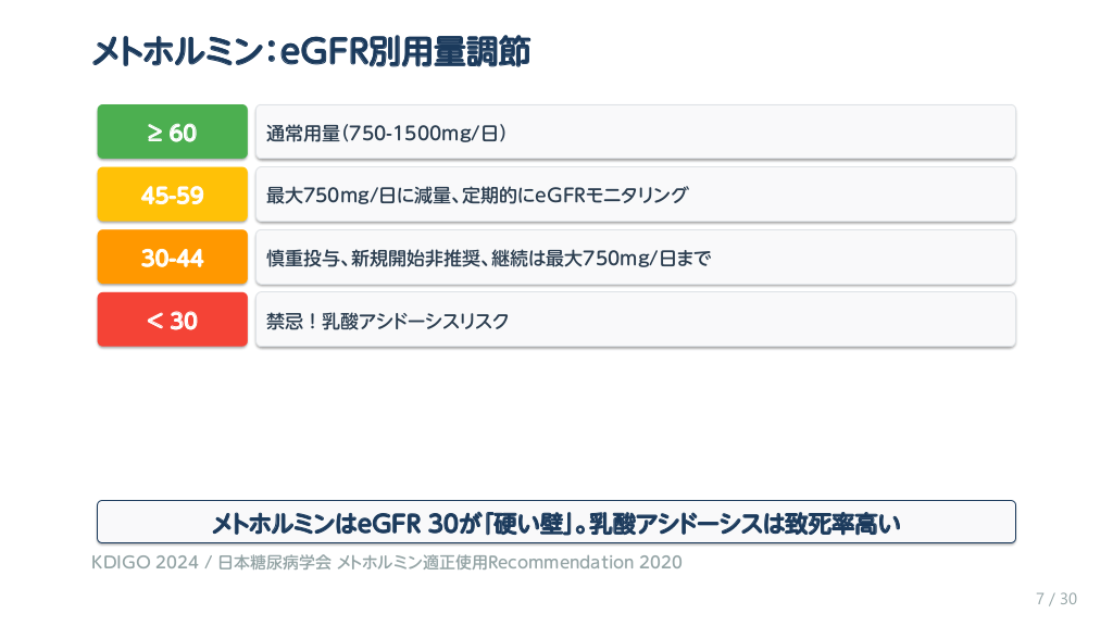 #8. メトホルミン:eGFR別用量調節 ≥ 60 通常用量(750-1500mg/日) 45-59 最大750mg/日に減量、定期的にeGFRモニタリング 30-44 慎重投与、新規開始非推奨、継続は最大750mg/日まで < 30 禁忌!乳酸アシドーシスリスク メトホルミンはeGFR 30が「硬い壁」。乳酸アシドーシスは致死率高い KDIGO 2024 / 日本糖尿病学会 メトホルミン適正使用Recommendation 2020 7 / 30