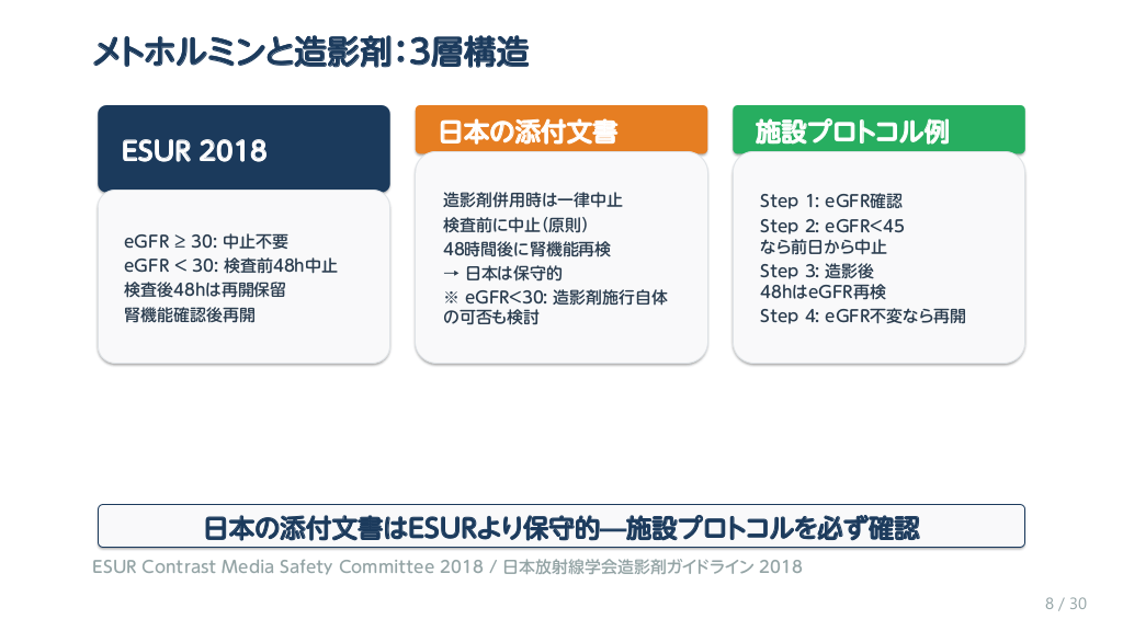#9. メトホルミンと造影剤:3層構造 ESUR 2018 eGFR ≥ 30: 中止不要 eGFR < 30: 検査前48h中止 検査後48hは再開保留 腎機能確認後再開 日本の添付文書 施設プロトコル例 造影剤併用時は一律中止 検査前に中止(原則) 48時間後に腎機能再検 → 日本は保守的 ※ eGFR<30: 造影剤施行自体 の可否も検討 Step 1: eGFR確認 Step 2: eGFR<45 なら前日から中止 Step 3: 造影後 48hはeGFR再検 Step 4: eGFR不変なら再開 日本の添付文書はESURより保守的—施設プロトコルを必ず確認 ESUR Contrast Media Safety Committee 2018 / 日本放射線学会造影剤ガイドライン 2018 8 / 30