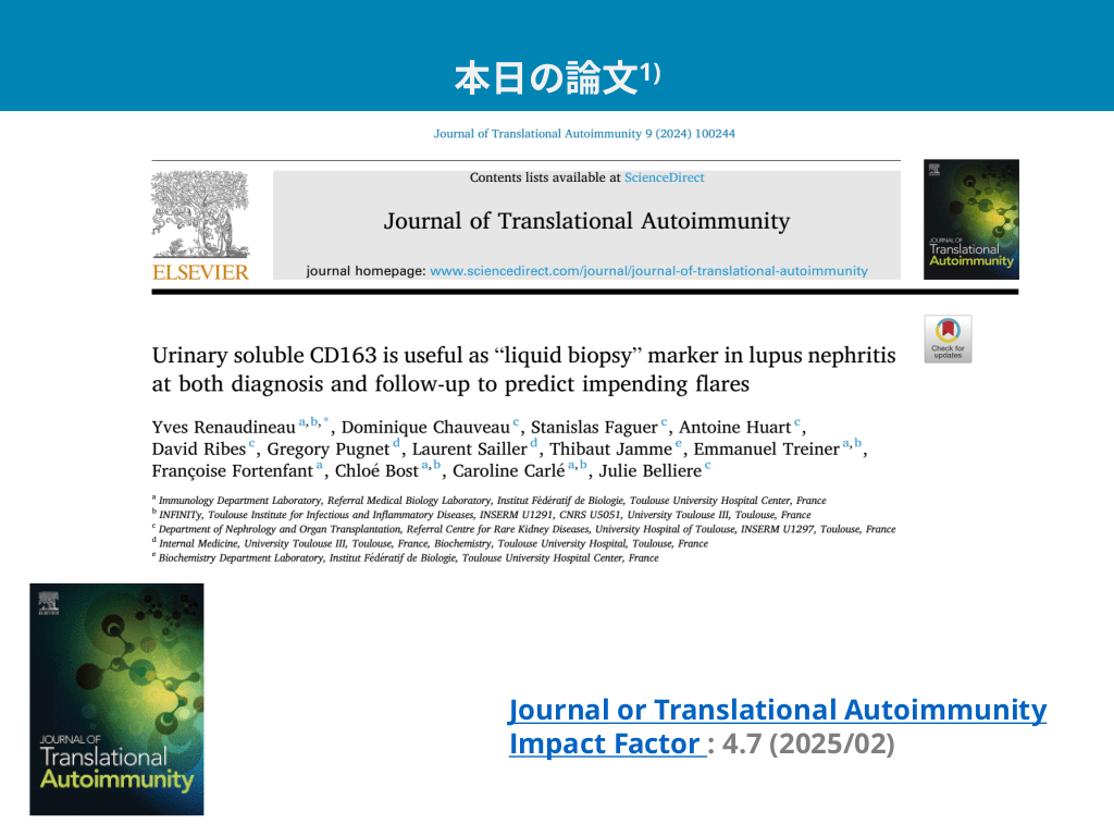 Renaudineau Y, Chauveau D, Faguer S, Huart A, Ribes D, Pugnet G et al. Urinary soluble CD163 is useful as "liquid biopsy" marker in lupus nephritis at both diagnosis and follow-up to predict impending flares. J Transl Autoimmun. 2024 Jun 20;9:100244. PMID: 39021518;