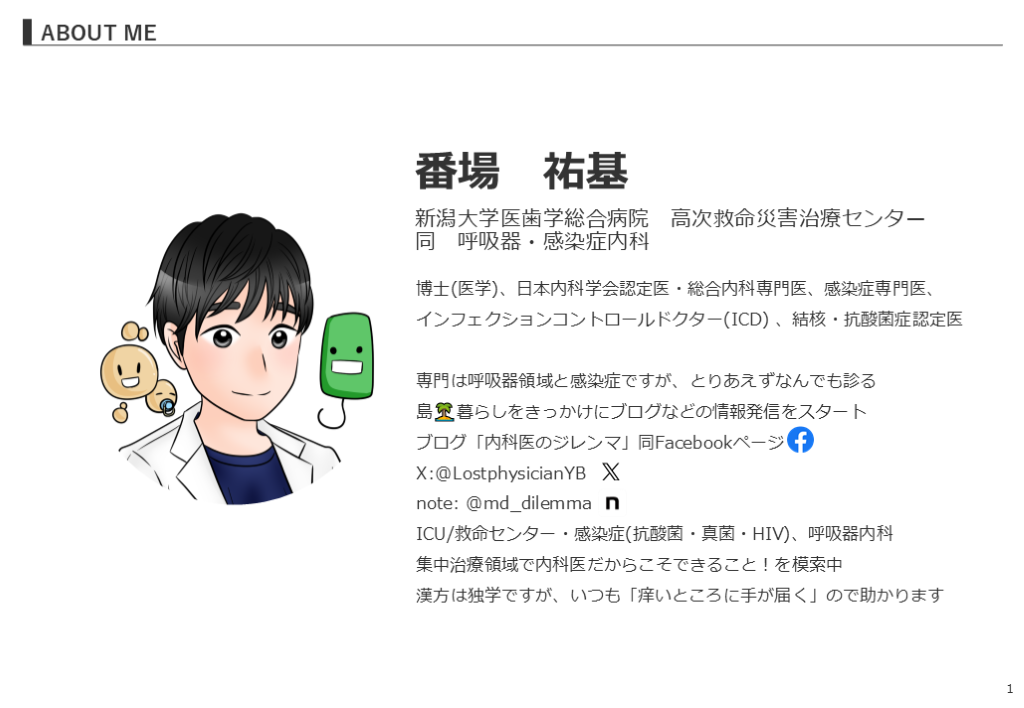 #2. 1 ABOUT ME 番場 祐基 新潟大学医歯学総合病院 高次救命災害治療センター同 呼吸器・感染症内科 博士(医学)、日本内科学会認定医・総合内科専門医、感染症専門医、インフェクションコントロールドクター(ICD) 、結核・抗酸菌症認定医