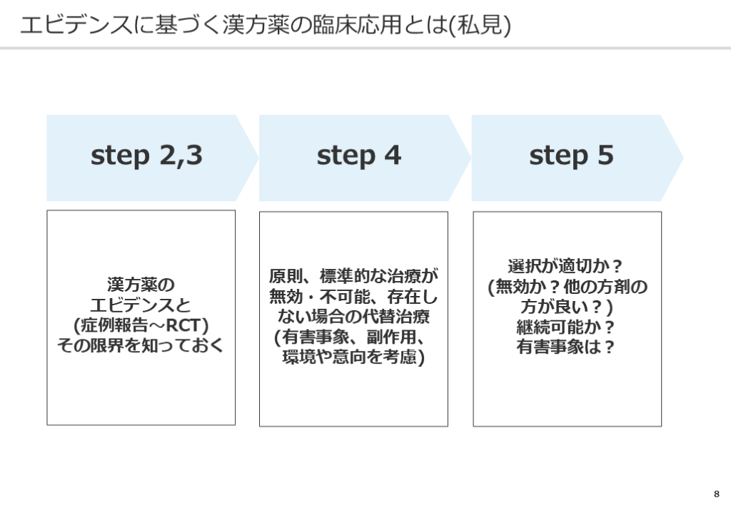 #9. エビデンスに基づく漢方薬の臨床応用とは(私見) 8 step 2,3 step 4 step 5 漢方薬のエビデンスと(症例報告〜RCT)その限界を知っておく 原則、標準的な治療が無効・不可能、存在しない場合の代替治療(有害事象、副作用、環境や意向を考慮) 選択が適切か?(無効か?他の方剤の方が良い?)