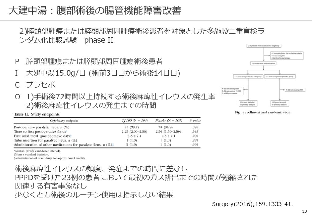 #14. 13 大建中湯:腹部術後の腸管機能障害改善 2)膵頭部腫瘍または膵頭部周囲腫瘍術後患者を対象とした多施設二重盲検ランダム化比較試験 phase II 術後麻痺性イレウスの頻度、発症までの時間に差なし