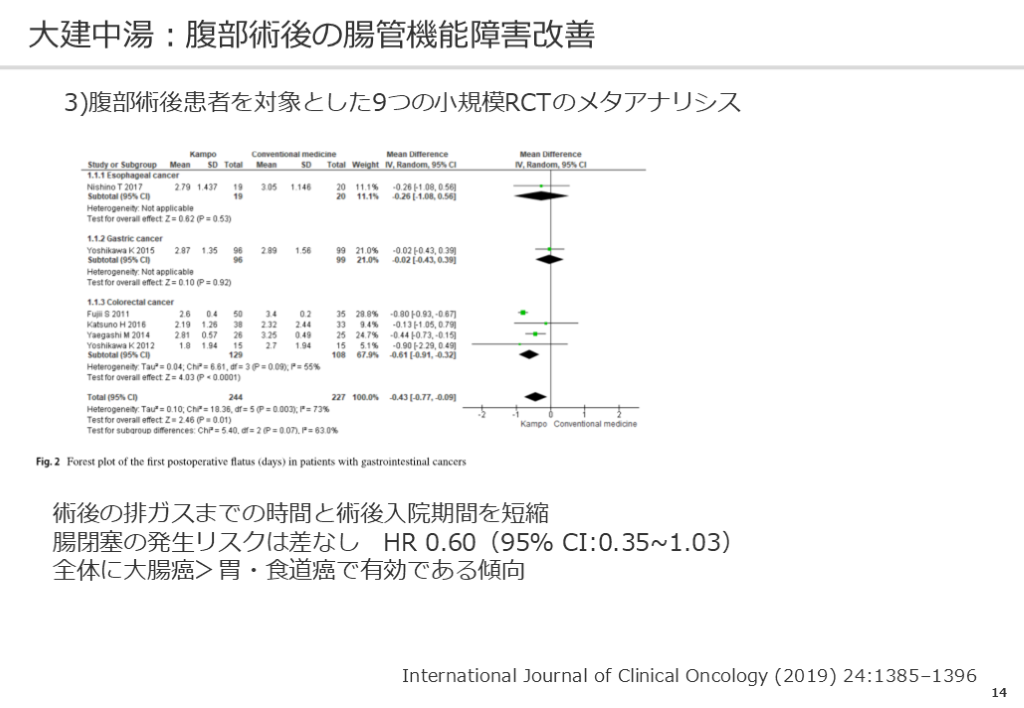 #15. 14 大建中湯:腹部術後の腸管機能障害改善 3)腹部術後患者を対象とした9つの小規模RCTのメタアナリシス International Journal of Clinical Oncology (2019) 24:1385–1396 術後の排ガスまでの時間と術後入院期間を短縮