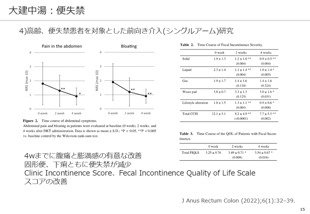 #16. 15 大建中湯:便失禁 4)高齢、便失禁患者を対象とした前向き介入(シングルアーム)研究 4wまでに腹痛と膨満感の有意な改善
