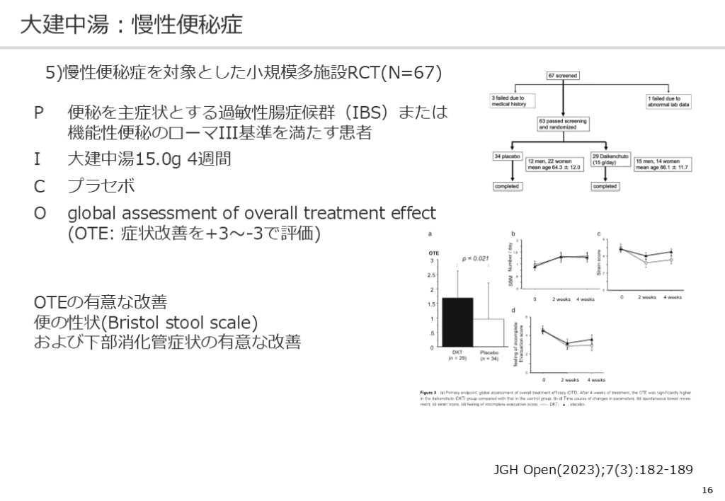 #17. 16 大建中湯:慢性便秘症 5)慢性便秘症を対象とした小規模多施設RCT(N=67) OTEの有意な改善