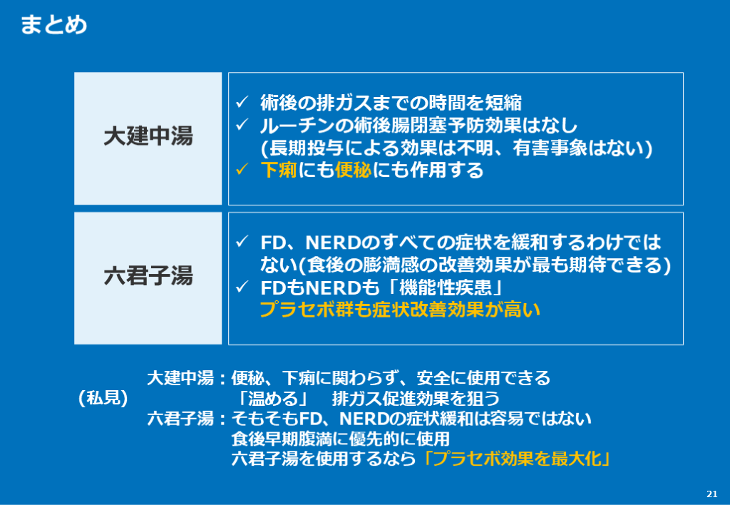 六君子湯:そもそもFD、NERDの症状緩和は容易ではない 食後早期腹満に優先的に使用 六君子湯を使用するなら「プラセボ効果を最大化」 (私見)