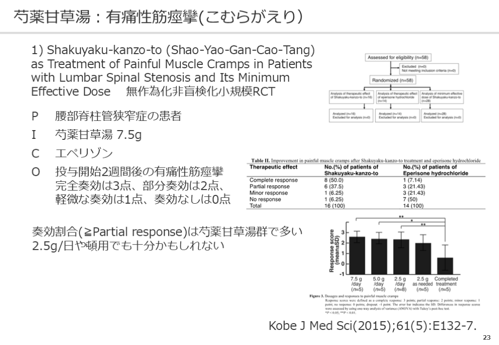 #24. 23 芍薬甘草湯:有痛性筋痙攣(こむらがえり) 1) Shakuyaku-kanzo-to (Shao-Yao-Gan-Cao-Tang) as Treatment of Painful Muscle Cramps in Patientswith Lumbar Spinal Stenosis and Its Minimum Effective Dose 無作為化非盲検化小規模RCT