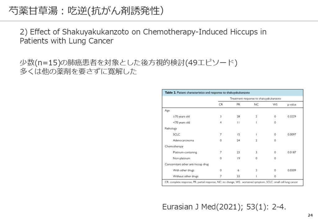#25. 24 芍薬甘草湯:吃逆(抗がん剤誘発性) 2) Effect of Shakuyakukanzoto on Chemotherapy-Induced Hiccups in