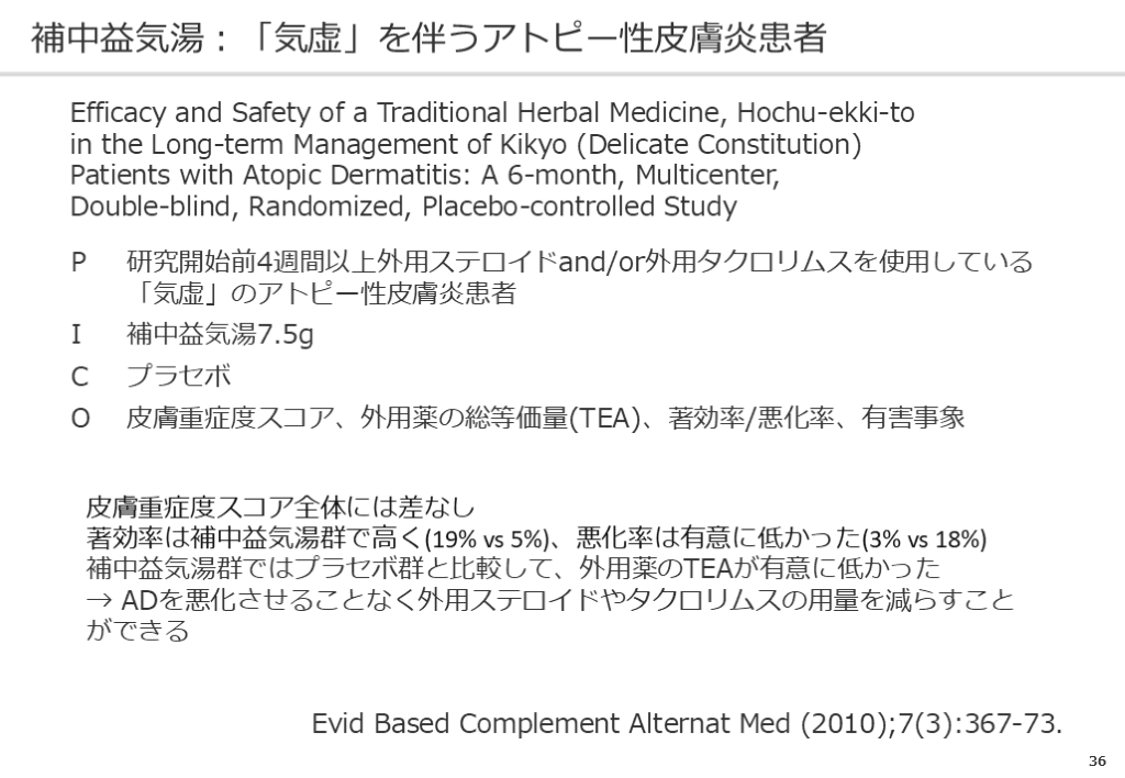 #37. 36 補中益気湯:「気虚」を伴うアトピー性皮膚炎患者 Evid Based Complement Alternat Med (2010);7(3):367-73. Efficacy and Safety of a Traditional Herbal Medicine, Hochu-ekki-to