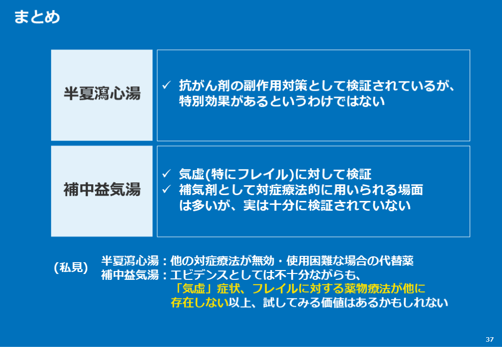 #38. まとめ 37 抗がん剤の副作用対策として検証されているが、特別効果があるというわけではない 気虚(特にフレイル)に対して検証