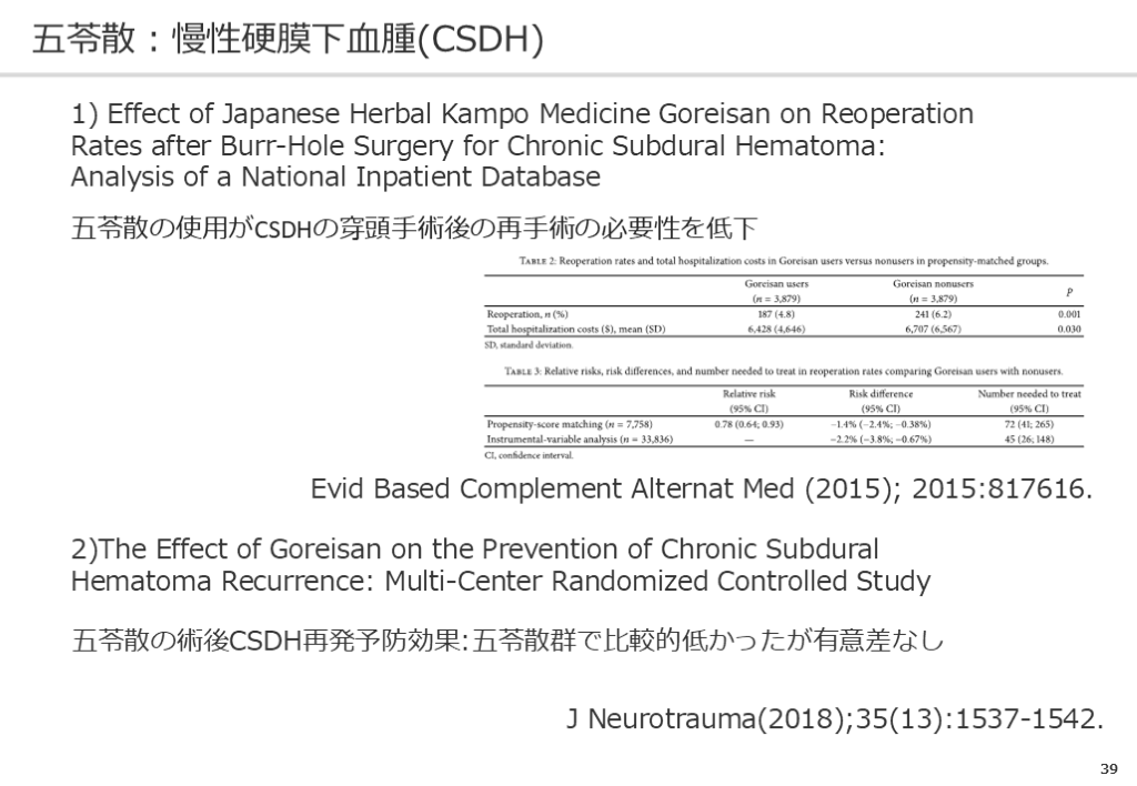 2)The Effect of Goreisan on the Prevention of Chronic Subdural Hematoma Recurrence: Multi-Center Randomized Controlled Study 五苓散の使用がCSDHの穿頭手術後の再手術の必要性を低下 五苓散の術後CSDH再発予防効果:五苓散群で比較的低かったが有意差なし J Neurotrauma(2018);35(13):1537-1542.