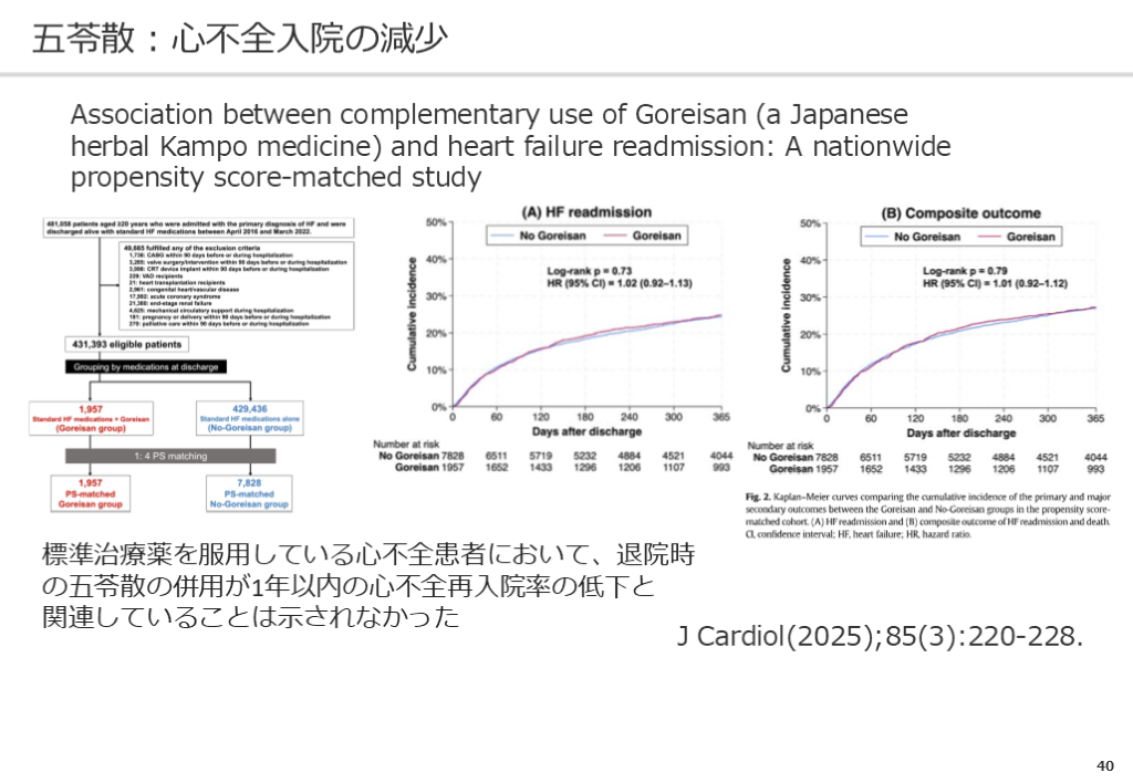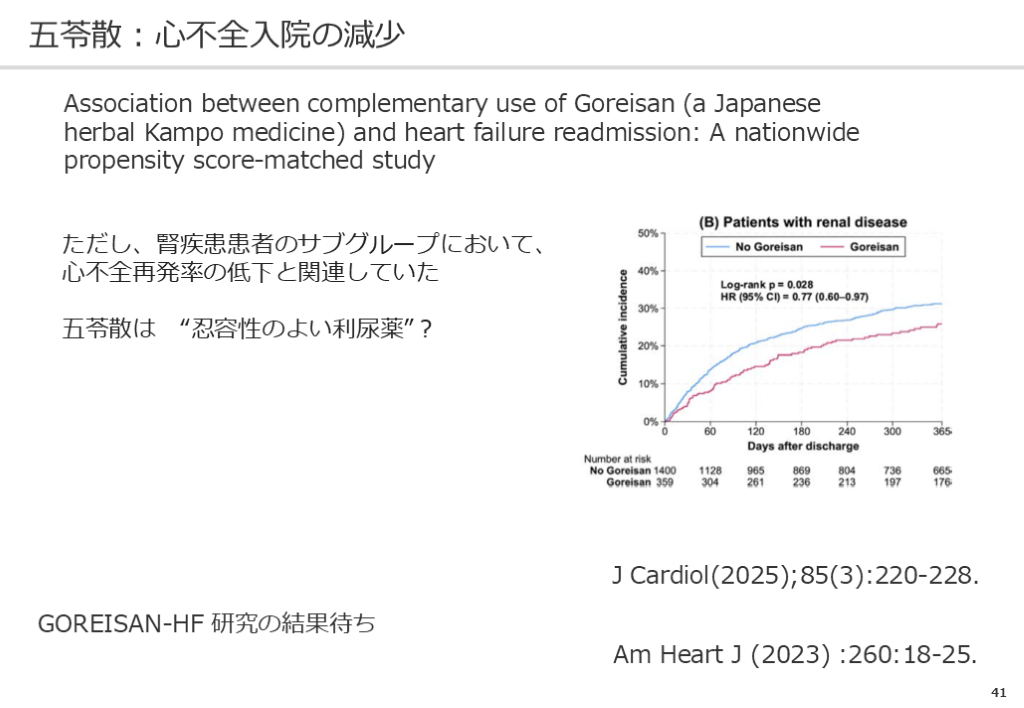 #41. 40 五苓散:心不全入院の減少 J Cardiol(2025);85(3):220-228. Association between complementary use of Goreisan (a Japanese herbal Kampo medicine) and heart failure readmission: A nationwide