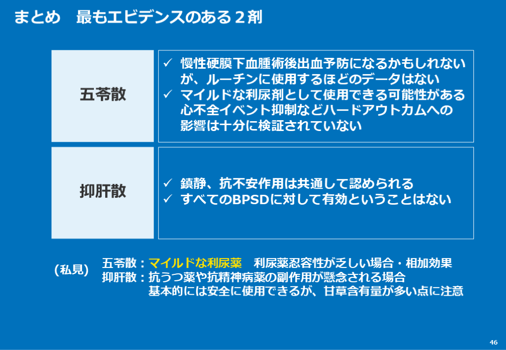 すべてのBPSDに対して有効ということはない 五苓散 抑肝散 五苓散:マイルドな利尿薬 利尿薬忍容性が乏しい場合・相加効果抑肝散:抗うつ薬や抗精神病薬の副作用が懸念される場合 基本的には安全に使用できるが、甘草含有量が多い点に注意 (私見)