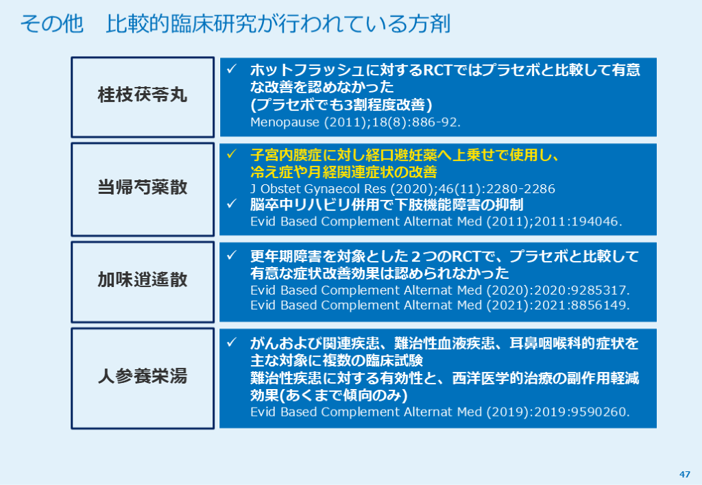 #48. その他 比較的臨床研究が行われている方剤 47 ホットフラッシュに対するRCTではプラセボと比較して有意な改善を認めなかった(プラセボでも3割程度改善)Menopause (2011);18(8):886-92. 子宮内膜症に対し経口避妊薬へ上乗せで使用し、冷え症や月経関連症状の改善J Obstet Gynaecol Res (2020);46(11):2280-2286
