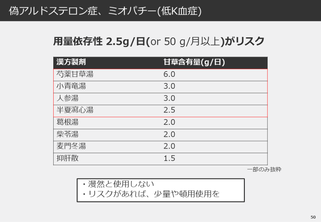 #51. 50 偽アルドステロン症、ミオパチー(低K血症) 用量依存性 2.5g/日(or 50 g/月以上)がリスク ・漫然と使用しない