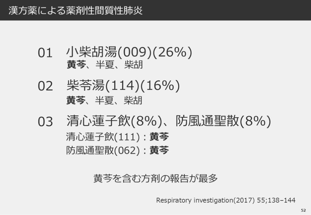 #53. 52 漢方薬による薬剤性間質性肺炎 Respiratory investigation(2017) 55;138–144 小柴胡湯(009)(26%) 黄芩、半夏、柴胡