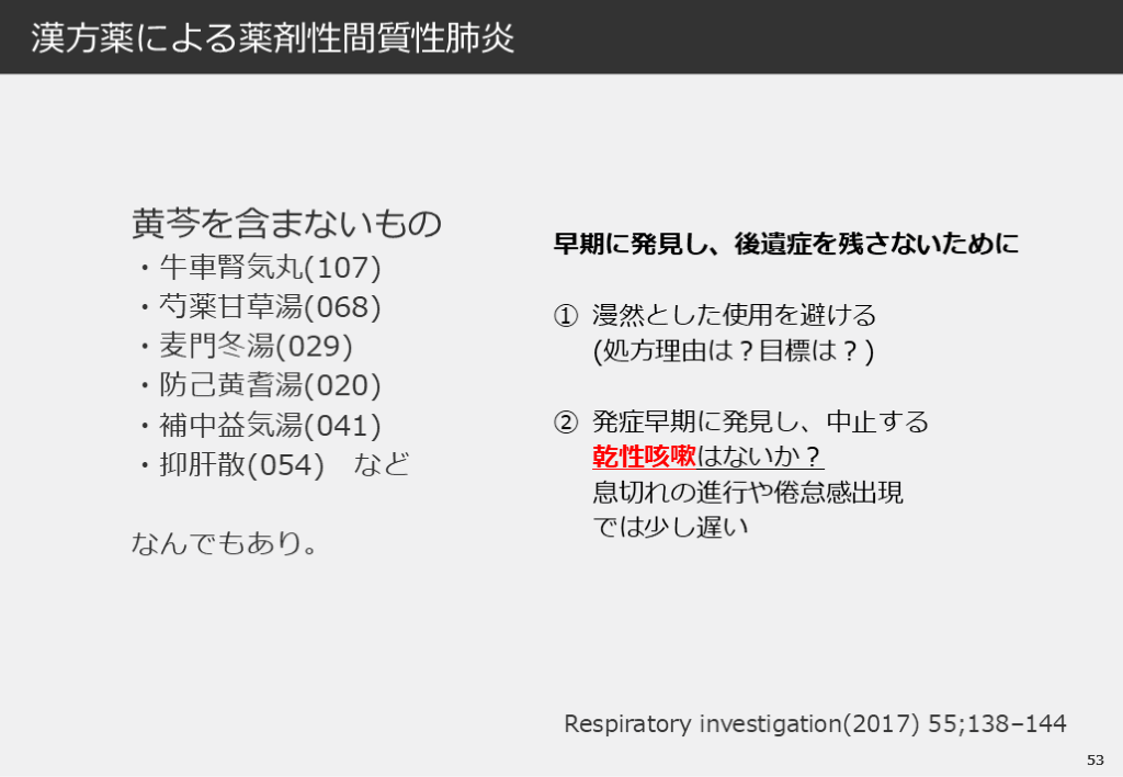 #54. 53 漢方薬による薬剤性間質性肺炎 Respiratory investigation(2017) 55;138–144 黄芩を含まないもの