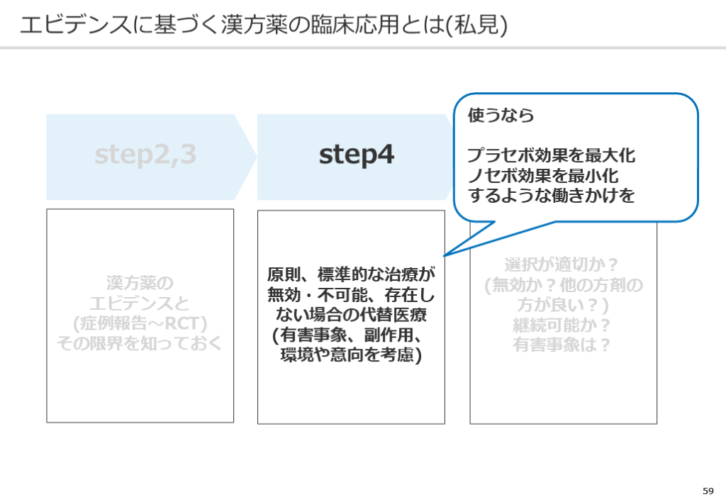 #59. エビデンスに基づく漢方薬の臨床応用とは(私見) 58 step2,3 step4 step5 漢方薬のエビデンスと(症例報告〜RCT)その限界を知っておく 原則、標準的な治療が無効・不可能、存在しない場合の代替医療(有害事象、副作用、環境や意向を考慮) 選択が適切か?(無効か?他の方剤の方が良い?)