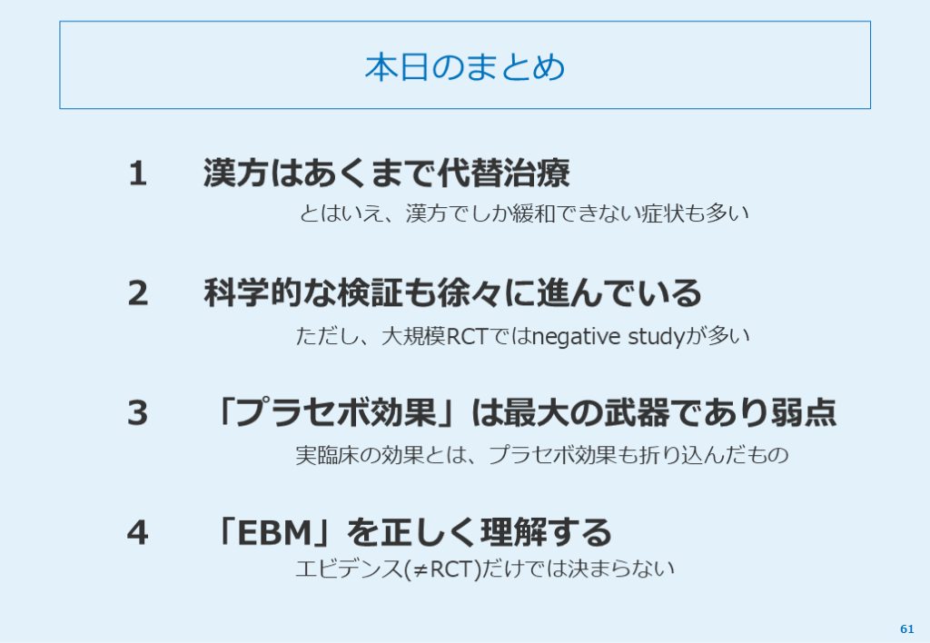 #62. 本日のまとめ 61 1 2 3 漢方はあくまで代替治療 科学的な検証も徐々に進んでいる 「プラセボ効果」は最大の武器であり弱点 4 「EBM」を正しく理解する とはいえ、漢方でしか緩和できない症状も多い ただし、大規模RCTではnegative studyが多い 実臨床の効果とは、プラセボ効果も折り込んだもの エビデンス(≠RCT)だけでは決まらない