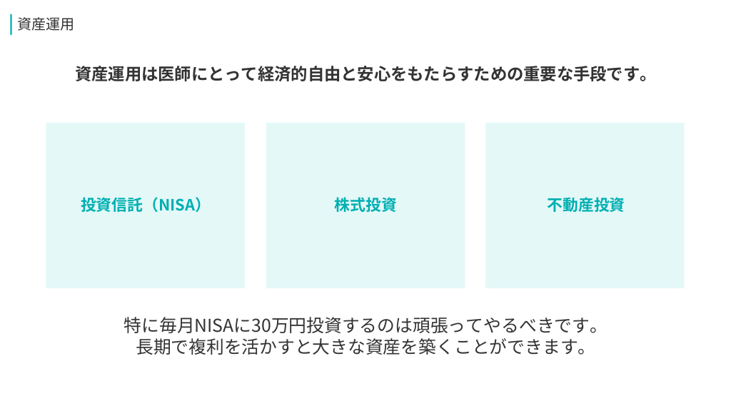 #10. 資産運用 資産運用は医師にとって経済的自由と安心をもたらすための重要な手段です。 投資信託(NISA) 株式投資 不動産投資 特に毎月NISAに30万円投資するのは頑張ってやるべきです。 長期で複利を活かすと大きな資産を築くことができます。