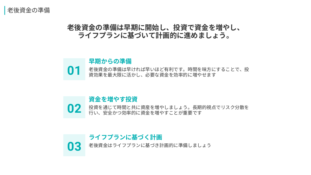 #12. 老後資金の準備 老後資金の準備は早期に開始し、投資で資金を増やし、 ライフプランに基づいて計画的に進めましょう。 01 02 03 早期からの準備 老後資金の準備は早ければ早いほど有利です。時間を味方にすることで、投 資効果を最大限に活かし、必要な資金を効率的に増やせます 資金を増やす投資 投資を通じて時間と共に資産を増やしましょう。長期的視点でリスク分散を 行い、安全かつ効率的に資金を増やすことが重要です ライフプランに基づく計画 老後資金はライフプランに基づき計画的に準備しましょう