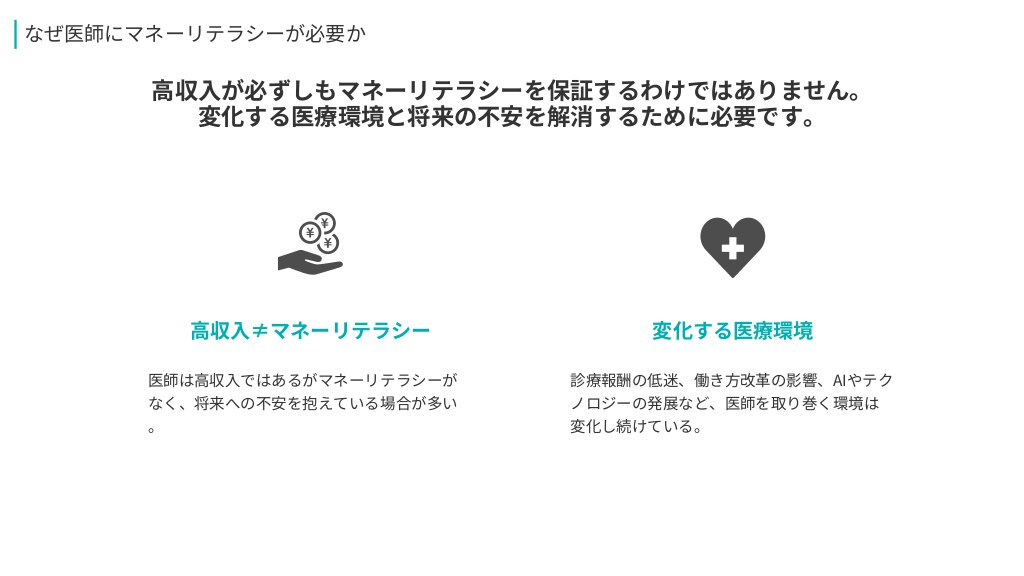#2. なぜ医師にマネーリテラシーが必要か 高収入が必ずしもマネーリテラシーを保証するわけではありません。 変化する医療環境と将来の不安を解消するために必要です。 高収入≠マネーリテラシー 変化する医療環境 医師は高収入ではあるがマネーリテラシーが 診療報酬の低迷、働き方改革の影響、AIやテク なく、将来への不安を抱えている場合が多い ノロジーの発展など、医師を取り巻く環境は 。 変化し続けている。