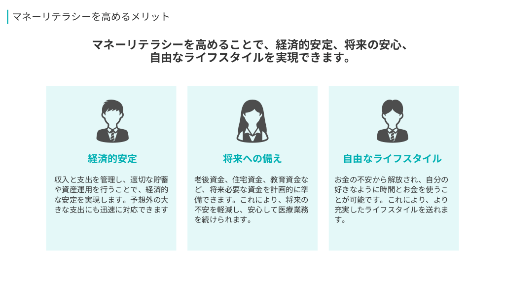#3. マネーリテラシーを高めるメリット マネーリテラシーを高めることで、経済的安定、将来の安心、 自由なライフスタイルを実現できます。 経済的安定 将来への備え 自由なライフスタイル 収入と支出を管理し、適切な貯蓄 や資産運用を行うことで、経済的 な安定を実現します。予想外の大 きな支出にも迅速に対応できます 老後資金、住宅資金、教育資金な ど、将来必要な資金を計画的に準 備できます。これにより、将来の 不安を軽減し、安心して医療業務 を続けられます。 お金の不安から解放され、自分の 好きなように時間とお金を使うこ とが可能です。これにより、より 充実したライフスタイルを送れま す。