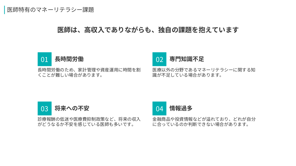 #6. 医師特有のマネーリテラシー課題 医師は、高収入でありながらも、独自の課題を抱えています 01 長時間労働 長時間労働のため、家計管理や資産運用に時間を割 くことが難しい場合があります。 03 将来への不安 診療報酬の低迷や医療費抑制政策など、将来の収入 がどうなるか不安を感じている医師も多いです。 02 専門知識不足 医療以外の分野であるマネーリテラシーに関する知 識が不足している場合があります。 04 情報過多 金融商品や投資情報などが溢れており、どれが自分 に合っているのか判断できない場合があります。
