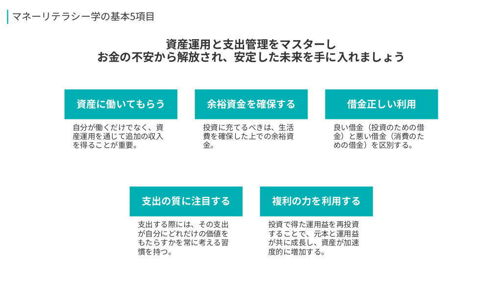 #7. マネーリテラシー学の基本5項目 資産運用と支出管理をマスターし お金の不安から解放され、安定した未来を手に入れましょう 資産に働いてもらう 余裕資金を確保する 自分が働くだけでなく、資 産運用を通じて追加の収入 を得ることが重要。 投資に充てるべきは、生活 費を確保した上での余裕資 金。 借金正しい利用 良い借金(投資のための借 金)と悪い借金(消費のた めの借金)を区別する。 支出の質に注目する 複利の力を利用する 支出する際には、その支出 が自分にどれだけの価値を もたらすかを常に考える習 慣を持つ。 投資で得た運用益を再投資 することで、元本と運用益 が共に成長し、資産が加速 度的に増加する。