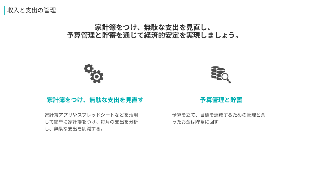 #8. 収入と支出の管理 家計簿をつけ、無駄な支出を見直し、 予算管理と貯蓄を通じて経済的安定を実現しましょう。 家計簿をつけ、無駄な支出を見直す 予算管理と貯蓄 家計簿アプリやスプレッドシートなどを活用 予算を立て、目標を達成するための管理と余 して簡単に家計簿をつけ、毎月の支出を分析 ったお金は貯蓄に回す し、無駄な支出を削減する。